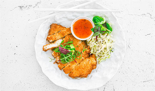 Chicken katsu, served with cabbage salad & sweet chili sauce
