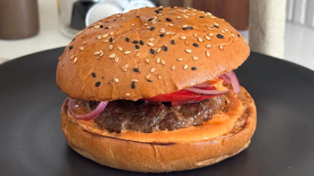 3.While the fries are cooking, grill the burgers and assemble by spreading a generous amount of the feta sauce into the burger buns, adding the burgers, tomato slices and topping with some pickled onions