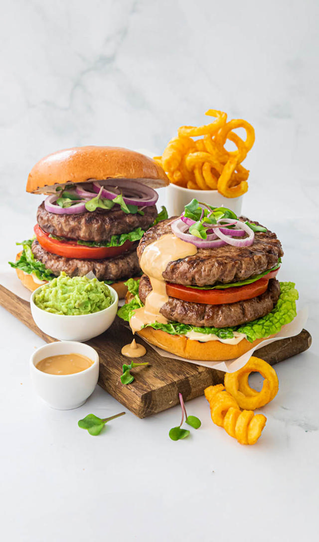 Irish Burger with Pivo Dolly beer sauce & avocado mash on Brioche Bread served with curly potatoes
