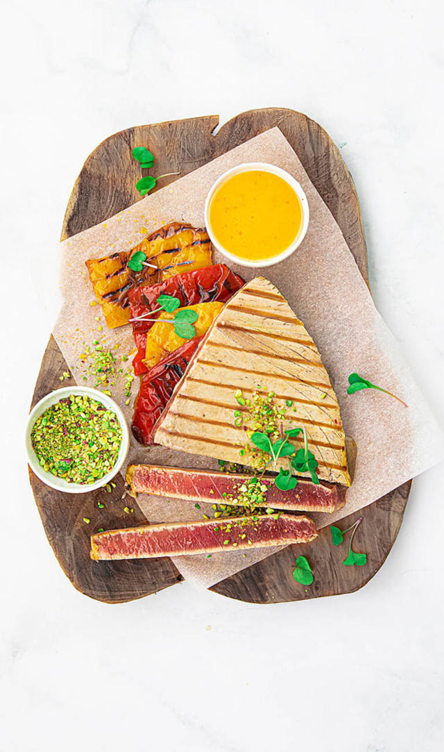 'Tuna Fillet' with grated pistachio, served with grilled peppers & spicy olive oil sauce