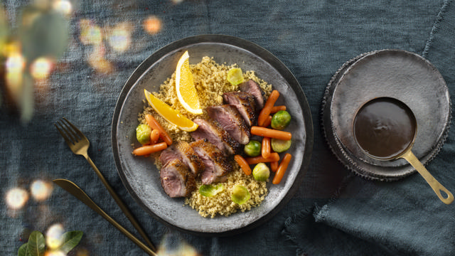 1. Cut the duck fillets from the fat side in diagonal vertical lines and marinate the duck with the Epic Spice, orange zest, olive oil, honey and salt and pepper