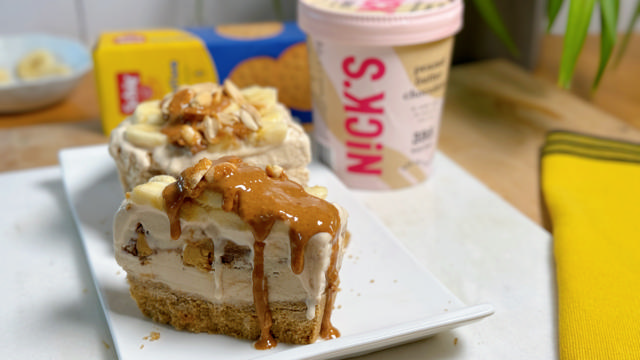 5. Cut 1 Fulfil protein bar into thin slices and add on top of your ice-cream cake. Add 3 scoops of crunchy peanut butter.