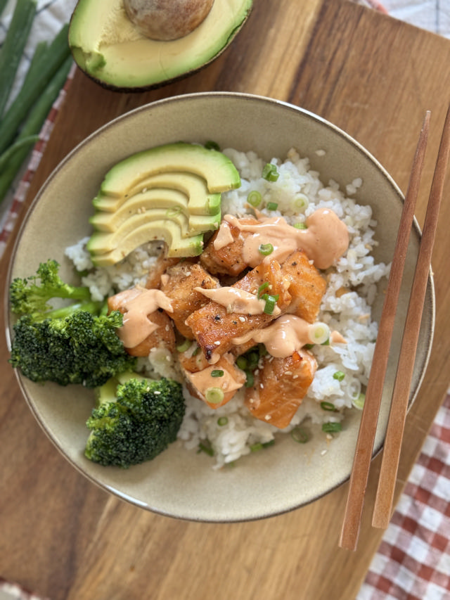 4. Serve the rice in a bowl with the salmon and add the sliced avocado, a few pieces of broccoli and the chopped onion.