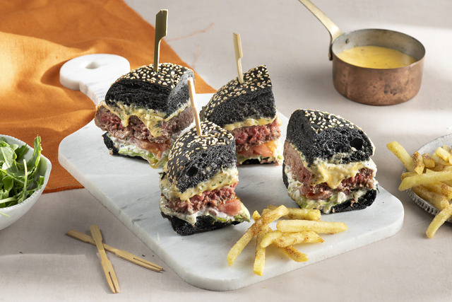 6.Put truffle mayonnaise on the base, lettuce, a slice of tomato, the burger, top with a spoonful of cheese sauce, 1 pickled cucumber, 2 slices of white truffle and a little mayonnaise on the top of the bun.