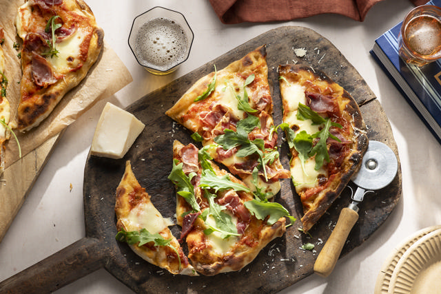 10.Add the tomato sauce, mozzarella cheese and prosciutto. Drizzle a little olive oil over the toppings and season with salt and pepper.