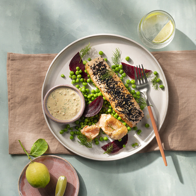 4. Serve the salmon and the garden peas along with the beetroot slices.