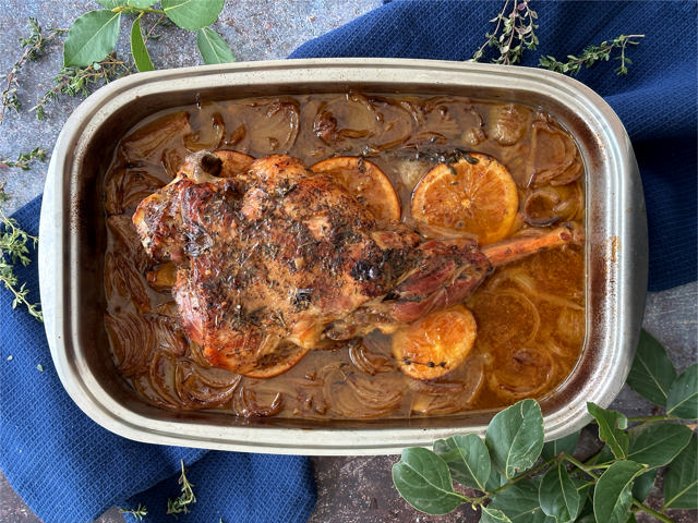 Preheat the oven to 200°C. Place the leg of lamb on a tray and wipe it with kitchen paper. Season both sides with Epic Spice lamb rub and salt. With a sharp knife, poke 6-7 holes in the leg. Fill each hole with garlic and few sprigs of rosemary. In an oven tray, put olive oil and cover the base with the cut onion. Place the orange slices on top and scatter thyme springs and bay leaves. Add the lamb leg on top of them and put the tray in the oven and cook for 20 minutes.