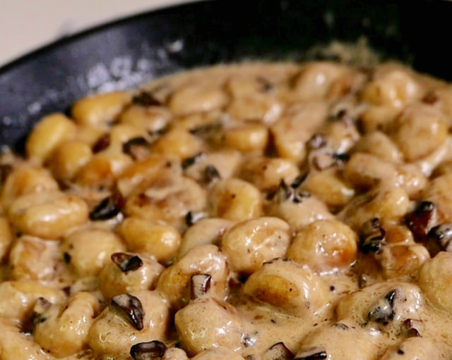 Gnocchi in parmesan sauce with mushrooms and hazelnuts