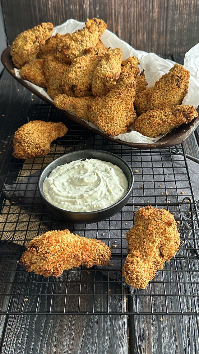 4. Dip the wings first in the egg and then in the bread. Place them on a grill over a baking tray. Bake for 40 minutes until crispy and golden. Serve with the blue cheese dip.