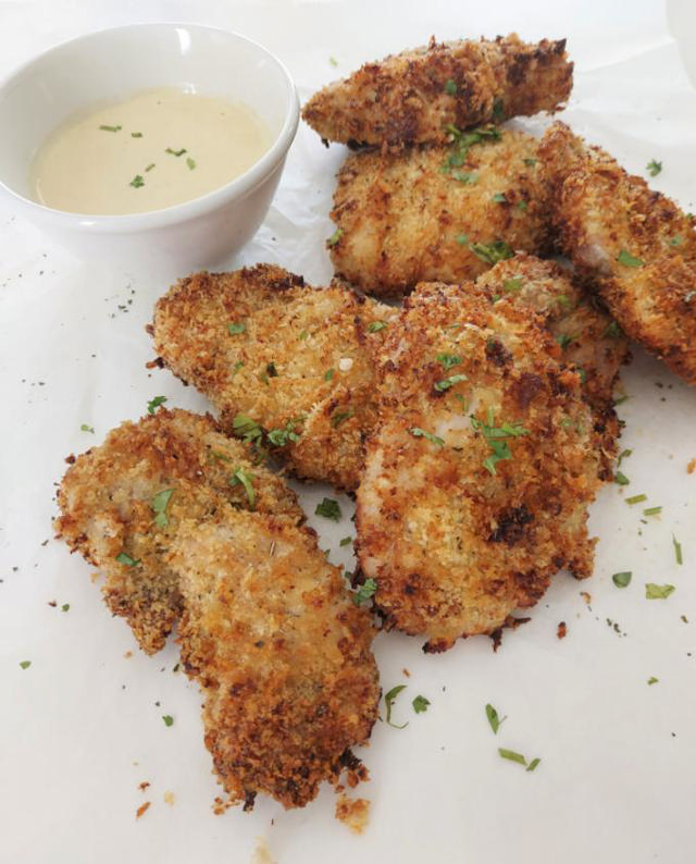 1. Prepare the mustard sauce and refrigerate it. 2. Season the chicken with salt and pepper, dip it into the egg mixture and then into the panko breadcrumbs mixture!
