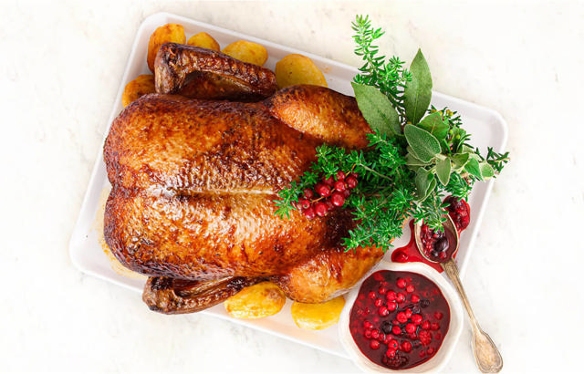 4. Tie the legs of the turkey with kitchen string and tuck the wings underneath.