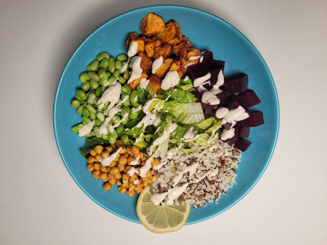 Boil the soybeans and cauliflower mixture according to the packages. Next, boil the chickpeas and then put them in a pan with a little olive oil, salt and pepper and paprika and bake them for 3-4 minutes in the air fryer at 180 degrees.Cut the sweet potato into cubes and add olive oil, salt and pepper and paprika and bake in the air fryer for 10 minutes at 190 degrees.