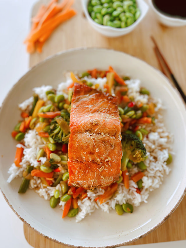 7. When everything is ready add some rice on your plate, then your vegetables and salmon last on the top ! Add some sauce from the salmon for extra flavor and enjoy!