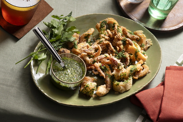 7.Serve the crispy squid strips with the verde sauce for a delicious combination.