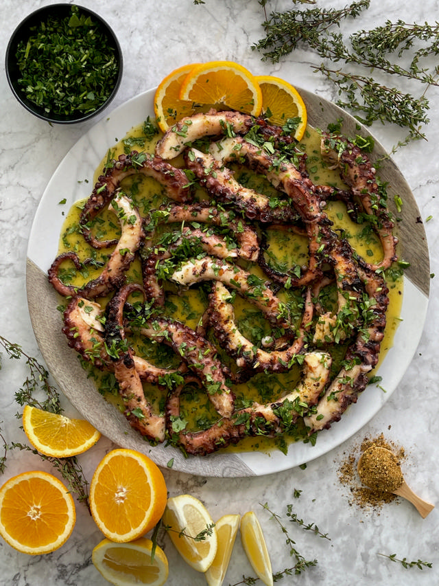 Place the bag with the octopus in a taper (in case the bag has a hole) and leave it in the fridge to marinate for 24-48 hours. Store the other half of the marinade in a closed taper in the refrigerator. Remove the octopus from the fridge at least 1 hour before cooking so that it has room temperature. Take the octopus pieces out of the bag and put the marinade in a bowl. Roast the octopus on the grill on high heat, passing it constantly with the marinade until it turns brown and makes a nice crust. Put it on a plate and pour the remaining marinade/dressing over it. Serve hot or at room temperature.