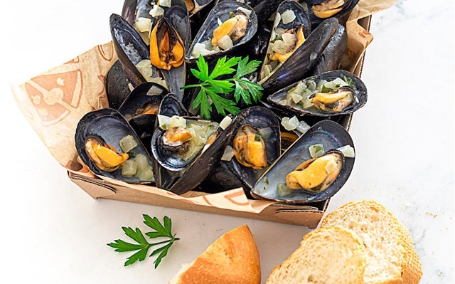 3. Add the mussels and stir. Add wine, parsley and cook for 2-3 minutes until the mussels open.