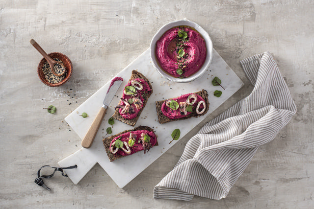 Pan- fried squid with beetroot hummus