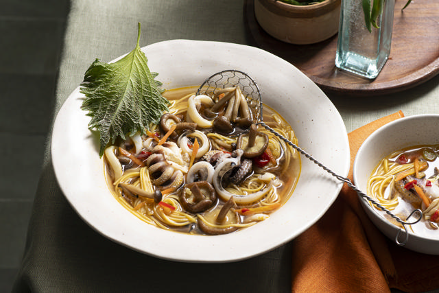 6.Divide the noodles into bowls and pour the soup with the cuttlefish and vegetables on top.