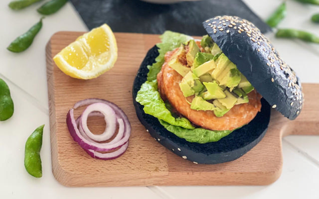 Add the salmon burgers with the bun to a plate and cut it in half. Accompany the burgers with some edamame beans for sharing on the side! Enjoy!