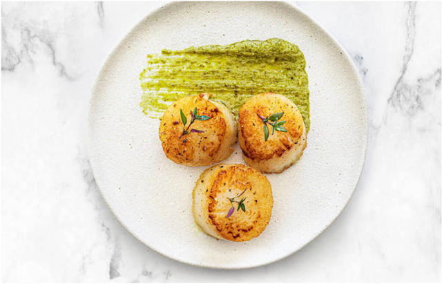 6. Serve the scallops with the pesto sauce, season with salt and pepper.