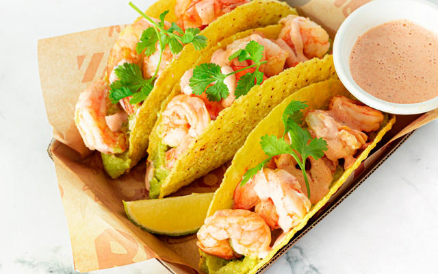 6. Spoon avocado purée into the warm tacos, add shrimps, drizzle with salsa and fresh coriander leaves and serve.