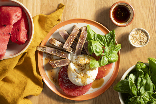 Tuna & Watermelon Salad Glazed with Teriyaki Sauce