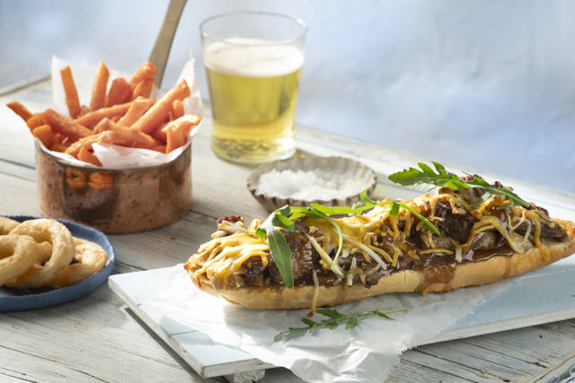 - Cut the baguettes in half and spread them with butter. Add the mixture with the steak and top with the caramelized onions and cheese. Place in the oven and grill until the cheese melts.