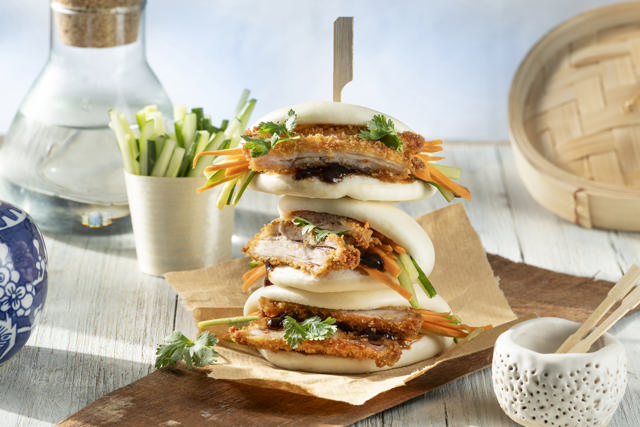 3. Fill the bao buns first with the sauce, then the vegetables and finally add the chicken.