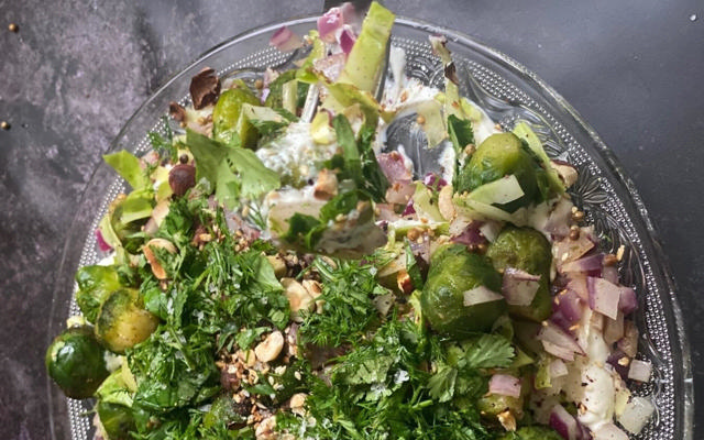 Spoon the sprout mix on top of the yoghurt mixture, scraping up the lovely crispy bits in the pan. Sprinkle the ground nuts and seeds over the top.