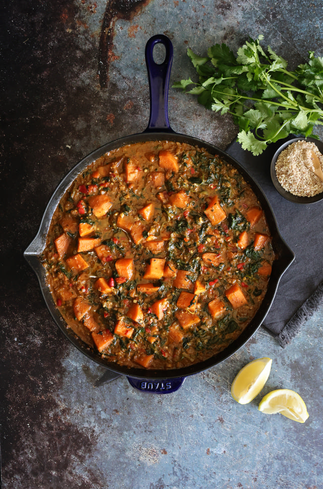8. Add the coconut milk and reduce the heat. Simmer for about 15 minutes until the sweet potato is cooked but not mushy.