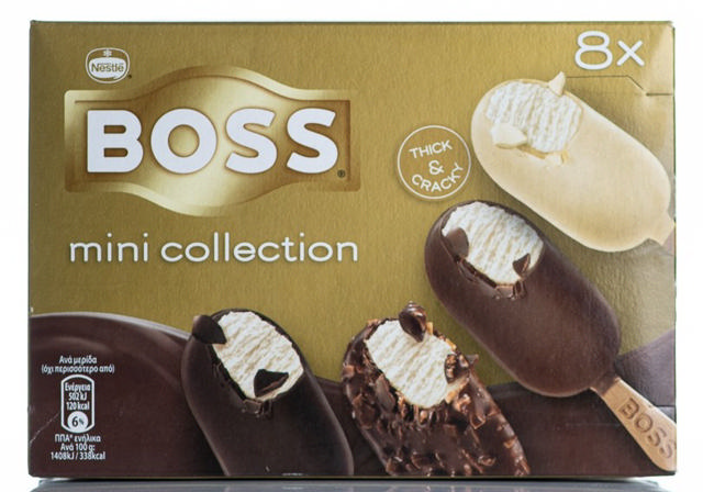 | Ingredients | (A) 2 x Vanilla ice cream (67.3%) with milk chocolate (32.7%): Reconstituted skimmed milk, sugar, fresh cream, water, cocoa butter, glucose-fructose syrup, whey powder, anhydrous milk fat, glucose syrup, lactose and milk proteins, cocoa mass, skimmed milk powder, emulsifier: E471, E322 (soy lecithin), E476, E410, E412, natural vanilla flavouring, crushed vanilla granules, colouring: E160b, E100. (B) 2 x Vanilla ice cream (67.3%) with white chocolate (32.7%): Reconstituted skimmed milk, sugar, fresh cream, water, cocoa mass, cocoa butter, glucose-fructose syrup, glucose syrup, lactose and milk proteins, anhydrous milk fat, skimmed milk powder, emulsifier: E471, E322 (soy lecithin), E476, E410, E412, natural vanilla flavouring, crushed vanilla granules, colouring: E160b, E100. (C) 2 x Vanilla ice cream (67.3%) with white chocolate (32.7%): Reconstituted skimmed milk, sugar, fresh cream, water, cocoa butter, glucose-fructose syrup, whey powder, glucose syrup, lactose and milk proteins, anhydrous milk fat, skimmed milk powder, emulsifier: E471, E322 (soy lecithin), E476, E410, E412, natural vanilla flavouring, crushed vanilla granules, colouring: E160b, E100. (D) 2 x Vanilla ice cream (63.5%) with milk chocolate (30.9%) and almonds (5.6%): Reconstituted skimmed milk, sugar, fresh cream, water, cocoa butter, roasted pieces of almonds, glucose-fructose syrup, whey powder, anhydrous milk fat, glucose syrup, lactose and milk proteins, cocoa mass, skimmed milk powder, emulsifier: E471, E322 (soy lecithin), E476, E410, E412, natural vanilla flavouring, crushed vanilla granules, colouring: E160b, E100. |
