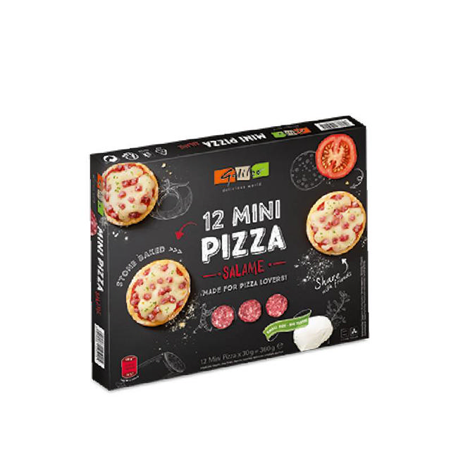 | Ingredients | wheat flour, water, passed tomatoes, mozzarella cheese (13%), salami (13%)(pork, bacon, nitrite curing salt (salt, preservative sodium nitrite), spiceextracts, dextrose, glucosesyrup, sugar, spices,antioxidant (sodium erythorbate, extract of rosemary), smoke), rapeseed oil, salt, yeast, durum wheat semolina, malted wheat flour, barley maltextract, sugar, oregano, wheat gluten, dextrose, black pepper |