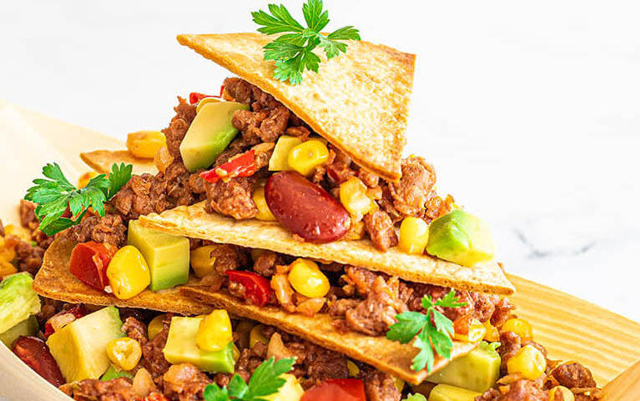10. Απλώνουμε σε ένα πιάτο μερικά από τα τριγωνάκια τορτίγιας και στρώνουμε από πάνω το μίγμα με τον κιμά και τη σαλάτα καλαμποκιού. Επαναλαμβάνουμε το στρώσιμο μέχρι να χρησιμοποιήσουμε όλα τα υλικά.